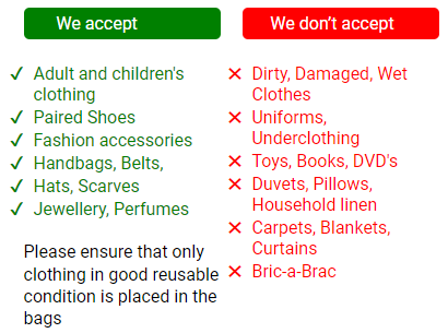 To take part you simply need to fill the Happy School bag or any type of plastic bin bag with unwanted but clean clothing. We accept both children’s and adult clothes including paired shoes, accessories (hats, belts, handbags, etc…).