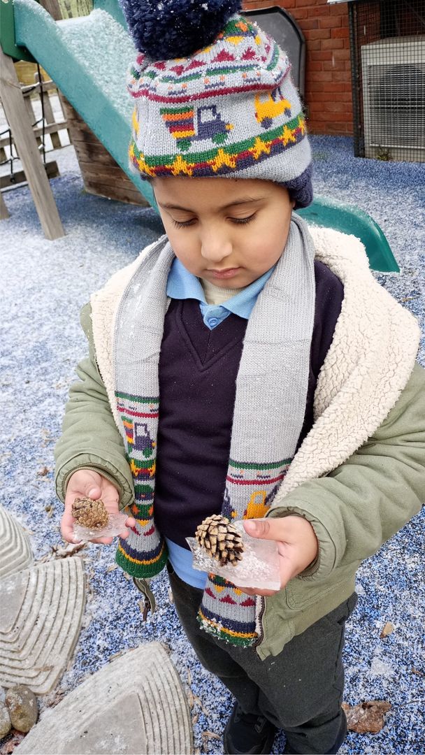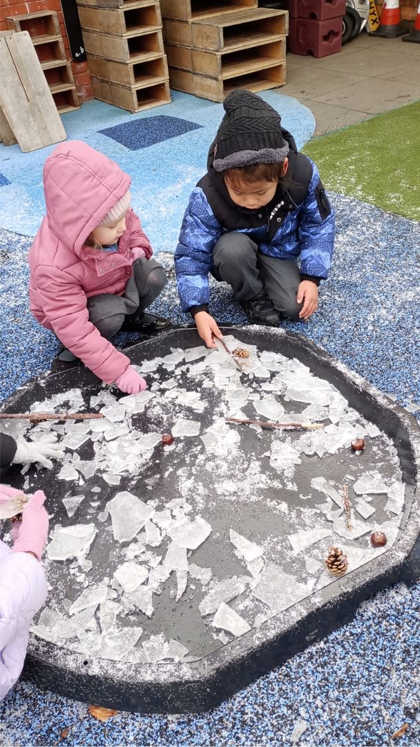 Rabbit Class have also been learning about the coldest season, winter. They enjoyed exploring and investigating the ice that had formed overnight. The children tried to melt the ice in their warm hands, but this made their hands cold. Some of the children used the hammer to smash the ice.