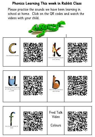 Practise c k u b f at home. Click on the QR codes to watch videos with Fred the Frog.