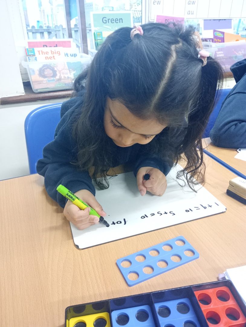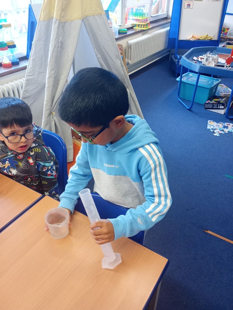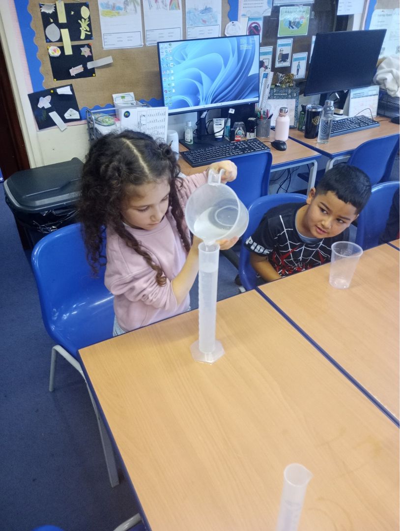 In our Maths lessons we have been starting to learn about capacity. The children loved practically filling containers and using the vocabulary full, empty and half full. We have also been carrying on learning how to write addition and subtraction number sentences and have started to solve simple word problems involving adding and taking away.