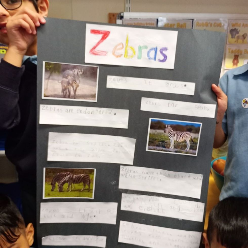 In our Literacy lessons we have been looking at stories set in Africa. The children have been interested to learn about the animals that you might find on safari and have been writing sentences using adjectives to describe them. We have also been matching the sentences found in the book to the pictures and have been highlighting nouns in small groups. We made a group poster about a zebra using a non-fiction book and the national geographic website to find out our own facts.