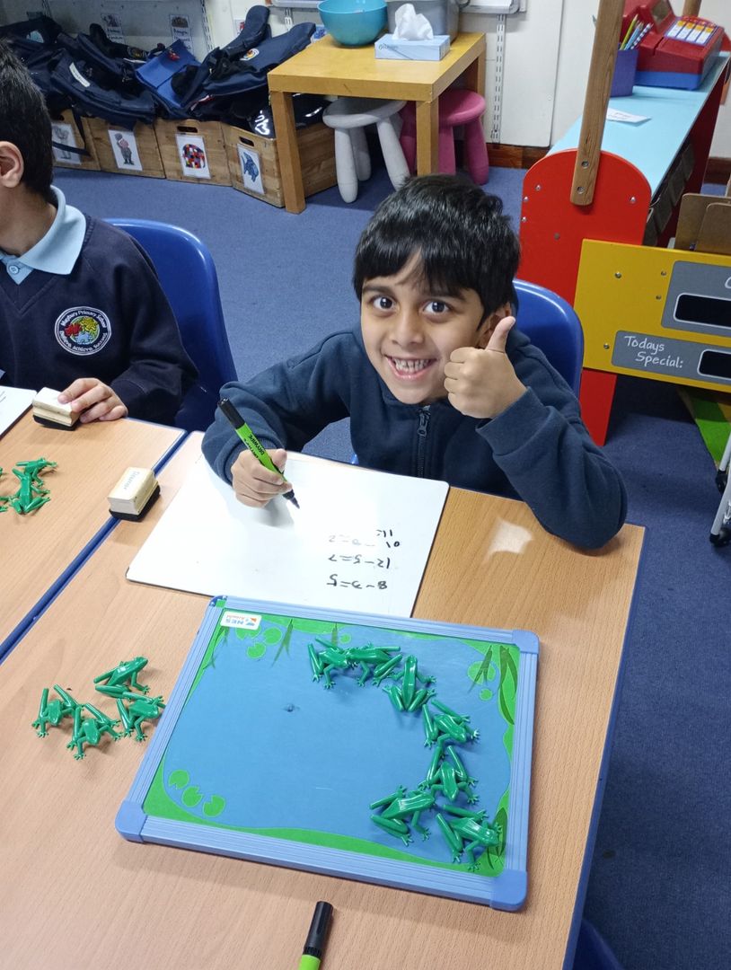In our Maths lessons we have been learning how to subtract and about all the other vocabulary that also means subtract. We have been physically taking away objects and jumping backwards along a number line as well as writing our own take away number sentences.