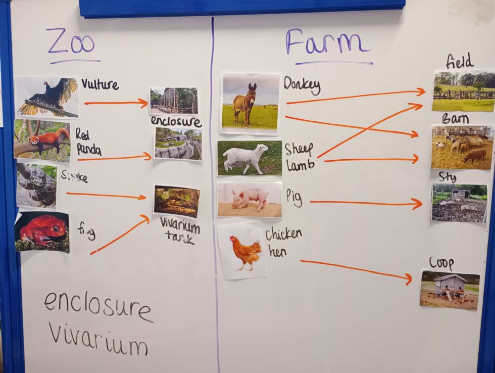 In Literacy, we have been reading Hairy Maclary and thinking about adjectives. We have rewritten the story, made changes to it and are working on writing our own story about animals causing chaos! The children have had some great ideas about what could happen in their own stories. We started by sorting animals into whether we would see them on a farm or at a zoo and then used them for our new stories.
