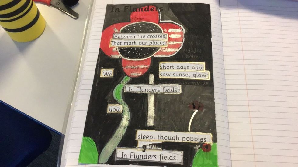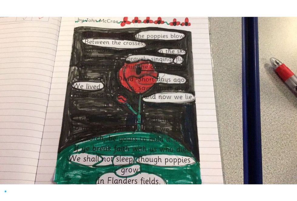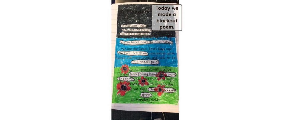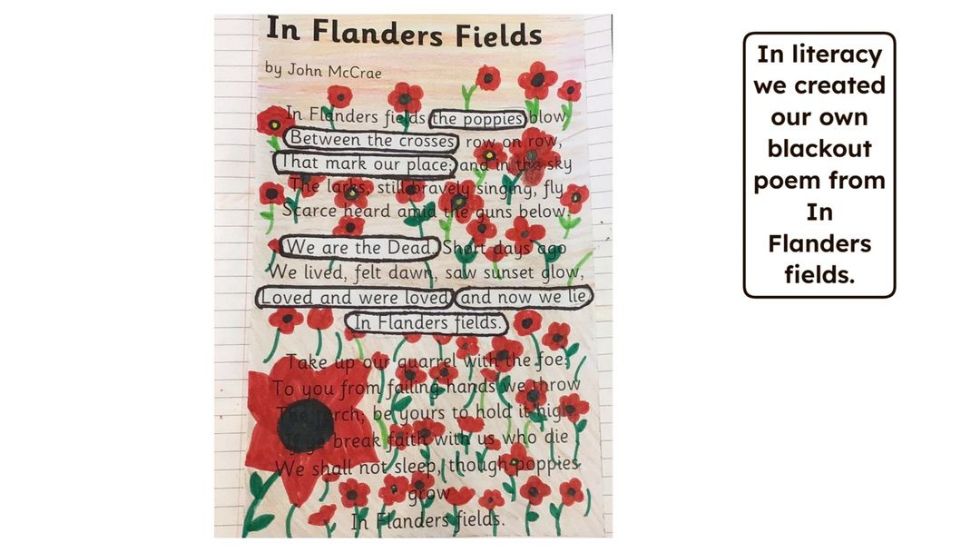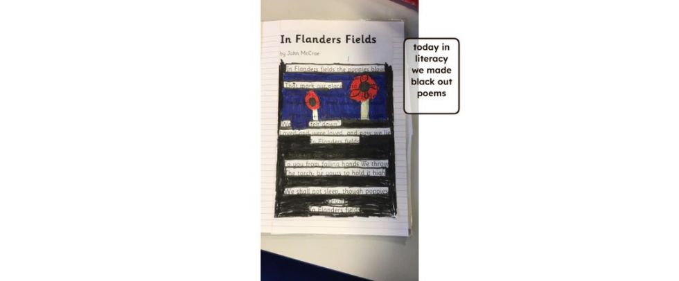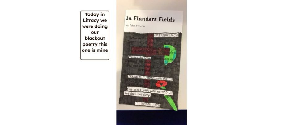 We began by looking at war poems and used the famous 'In Flander's Field' to create our own blackout poems. It was a new technique and the children made some fabulous poems.